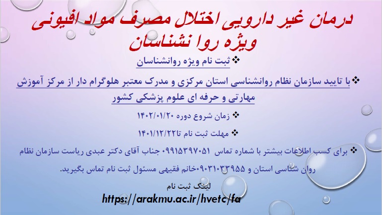 برگزاری دوره آموزشی و مهارتی اختلال مصرف مواد افیونی ویژه روان شناسان ۱۵ اسفند ۱۴۰۱ | ۰۸:۴۰ کد : ۳۲۸۶۷ اطلاعیه ارسال به دیگران نام شما ایمیل شما ایمیل دریافتکننده ارسال انصراف تعداد بازدید:۲۰۸۲۵ لینک ثبت نام
