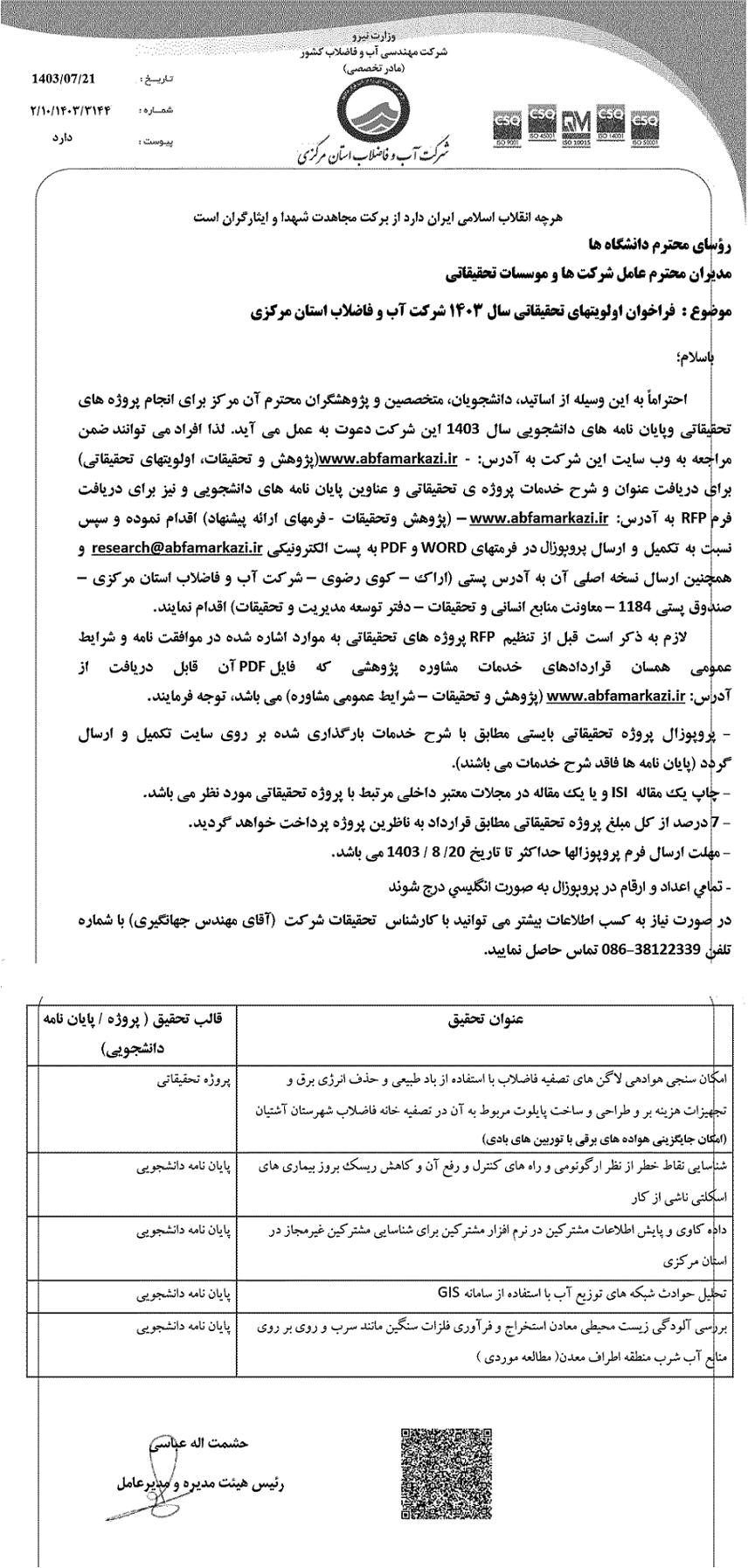 فراخوان اولویتهای تحقیقاتی شرکت آب و فاضلاب استان ۲۲ مهر ۱۴۰۳ | ۱۰:۳۵ کد : ۴۶۷۳۴ اطلاعیه ارسال به دیگران نام شما ایمیل شما ایمیل دریافتکننده ارسال انصراف تعداد بازدید:۱۱۸۵۰ فراخوان اولویتهای تحقیقاتی سال ۱۴۰۳ شرکت آب و فاضلاب استان مرکزی