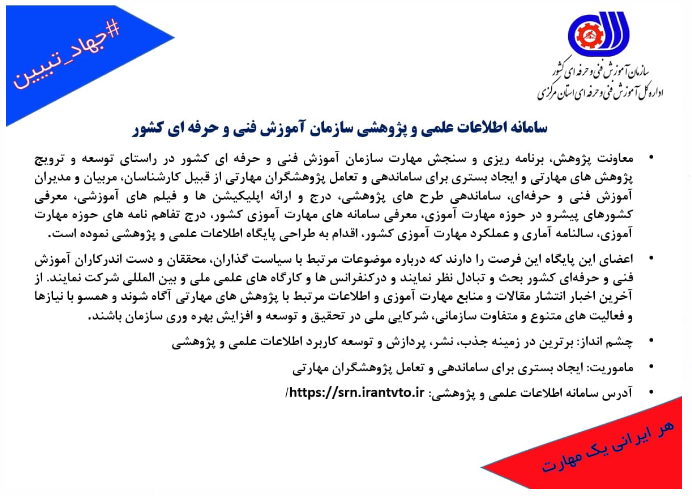 اداره کل آموزش فنی و حرفه ای استان مرکزی در راستای معرفی فعالیتهای سازمان مربوطه در زمینه ارائه آموزش های مهارتی و ماموریت های ذاتی این اداره در نظر دارد فعالیت های کلی صورت گرفته در مجموعه خویش را در قالب طرحی تحت عنوان " سه شنبه های مهارتی " به شرح ذیل انجام دهد.