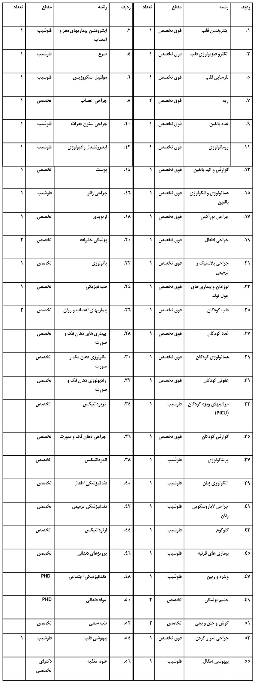 جدول رشته مقاطع مورد نیاز فراخوان بورس داخل دانشگاه علوم پزشکی و خدمات بهداشتی و درمانی بیرجند:
