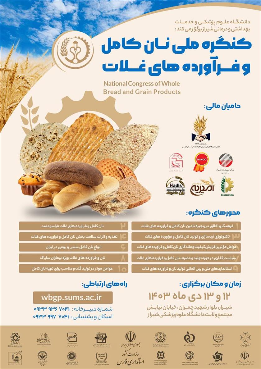 دانشگاه علوم پزشکی شیراز ، کنگره ملی نان کامل و فرآورده های غلات را در تاریخ ۱۲و۱۳ دی ماه برگزار می نماید.