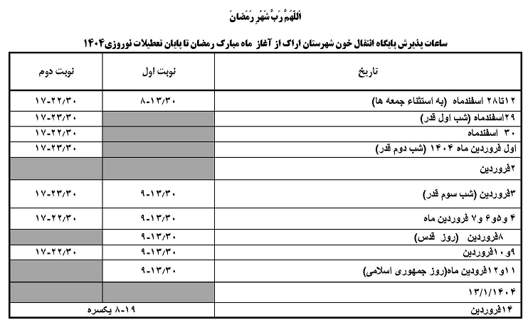 اعلام ساعات پذیرش اهدا کنندگان محترم در پایگاه انتقال خون شهرستان در ماه مبارک رمضان ۲۸ اسفند ۱۴۰۳ | ۱۳:۰۸ کد : ۵۰۲۶۹ اطلاعیه ارسال به دیگران نام شما ایمیل شما ایمیل دریافتکننده ارسال انصراف تعداد بازدید:۷۷۶۹ اعلام ساعات پذیرش اهدا کنندگان محترم در پایگاه انتقال خون شهرستان در ماه مبارک رمضان