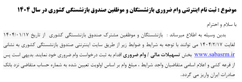 ثبت نام اینترنتی وام ضروری بازنشستگان و موظفین صندوق بازنشستگی کشوری ۲۰ فروردین ۱۴۰۴ | ۱۱:۵۹ کد : ۵۰۶۴۱ اطلاعیه ارسال به دیگران نام شما ایمیل شما ایمیل دریافتکننده ارسال انصراف تعداد بازدید:۵۱۰۶ ثبت نام اینترنتی وام ضروری بازنشستگان و موظفین صندوق بازنشستگی کشوری