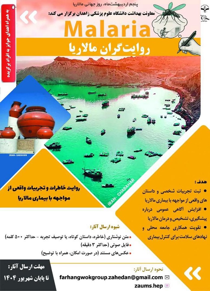 به اطلاع اساتید. پژوهشگران، دانشجویان و کارکنان می رساند ، به مناسبت روز جهانی مالاریا و همچنین در راستای سیاست های کلان وزارت بهداشت در زمینه آموزش و مشارکت عمومی، به منظور ارج نهادن به تلاش پرسنل عزیز برای نیل به حذف مالاریا، ثبت تجربیات شخصی و داستان های واقعی از مواجهه با بیماری مالاریا، افزایش آگاهی عمومی درباره پیشگیری، تشخیص و درمان مالاریا و تقویت همکاری جامعه محلی و نهادهای سلامت برای کنترل این بیماری مسابقه ملی روایتگران مالاریا در سطح کشور توسط دانشگاه علوم پزشکی زاهدان برگزار می گردد.