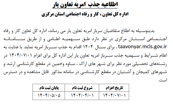اطلاعیه جذب امریه تعاون یار ۱۱ تیر ۱۴۰۴ | ۱۲:۰۴ کد : ۵۲۷۴۸ اطلاعیه ارسال به دیگران نام شما ایمیل شما ایمیل دریافتکننده ارسال انصراف تعداد بازدید:۱۶۷۳ اطلاعیه جذب امریه تعاون یار