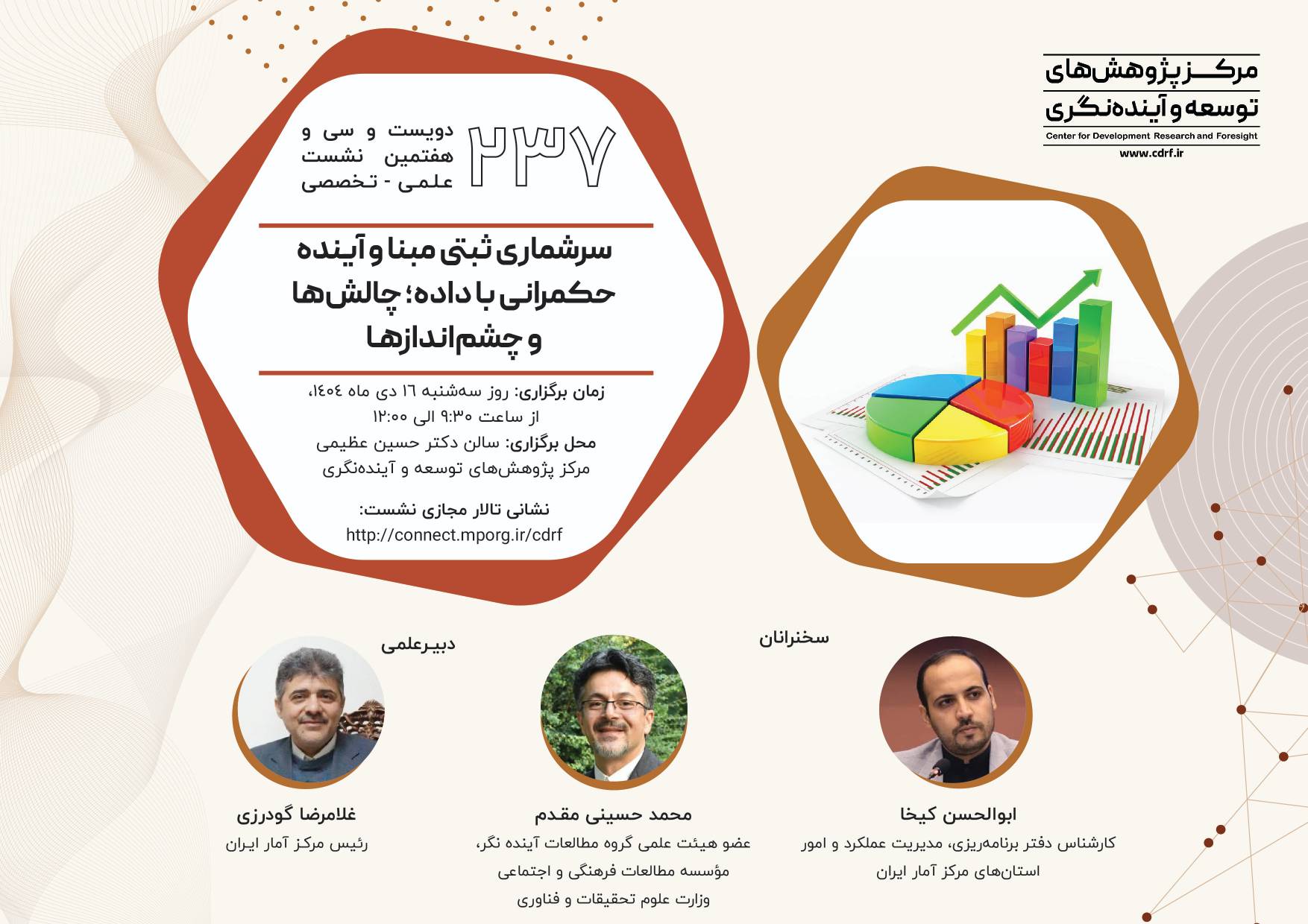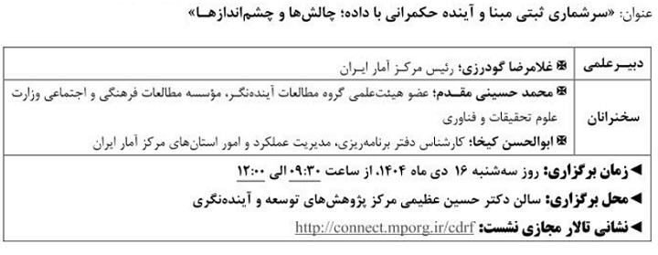 نشست علمی سرشماری ثبتی مبنا آینده حکمرانی با داده ۱۴ دی ۱۴۰۴ | ۱۰:۲۱ کد : ۵۷۴۱۸ اطلاعیه ارسال به دیگران نام شما ایمیل شما ایمیل دریافتکننده ارسال انصراف تعداد بازدید:۵۵۳ دویست وسی وهفتمین نشست علمی - تخصصی با عنوان سرشماری ثبتی مبنا آینده حکمرانی با داده، چالش ها وچشم اندازها
