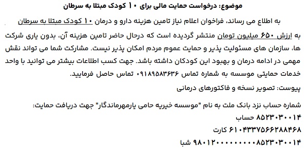 درخواست حمایت مالی، برای ۱۰ کودک مبتلا به سرطان ۰۷ بهمن ۱۴۰۴ | ۱۱:۳۳ کد : ۵۷۷۳۲ اطلاعیه ارسال به دیگران نام شما ایمیل شما ایمیل دریافتکننده ارسال انصراف تعداد بازدید:۱۷۲ موسسه خیریه حامی یار، درخواست حمایت مالی، برای ۱۰ کودک مبتلا به سرطان را دارد.